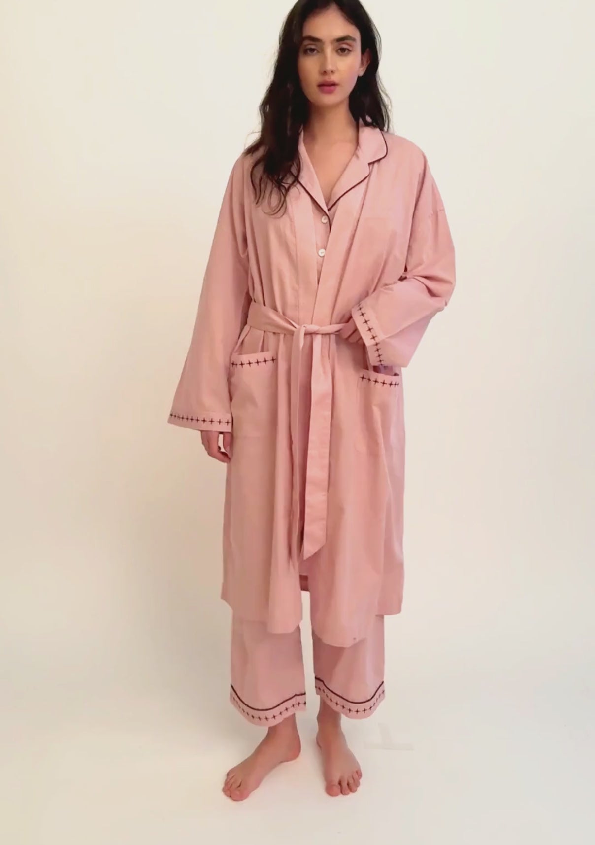 Made from a cotton and linen blend, this pink robe with blackberry embroidery is comfortable and breathable. The sewn-in robe tie ensures it will never get lost. With a relaxed fit, it drapes effortlessly and can be worn over matching pyjamas or as a comfortable loungewear piece.