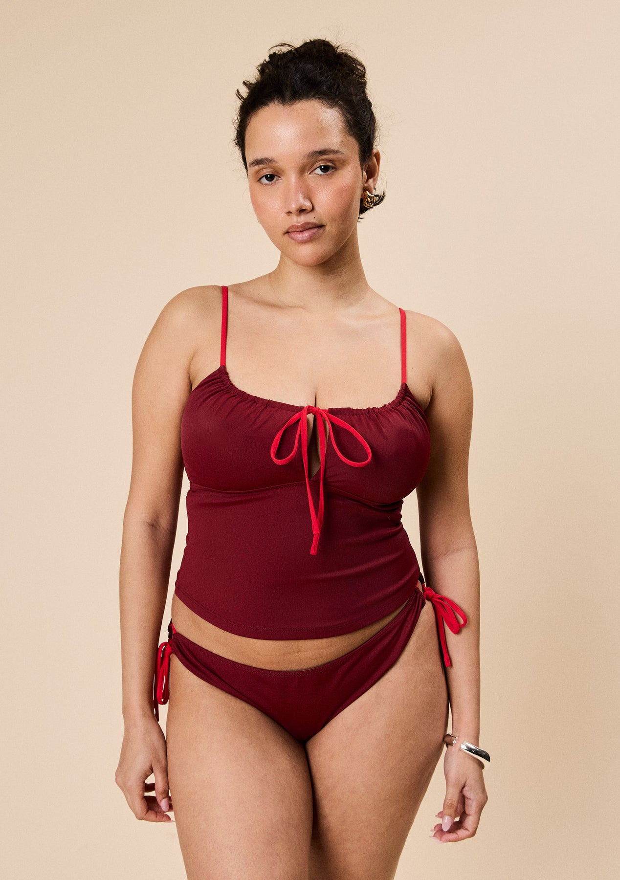 Introducing TBCo Swim - for those who want their personal style to carry right to the water’s edge. With a flattering adjustable fit, these burgundy and red tankini bottoms work harder than your average swimwear.