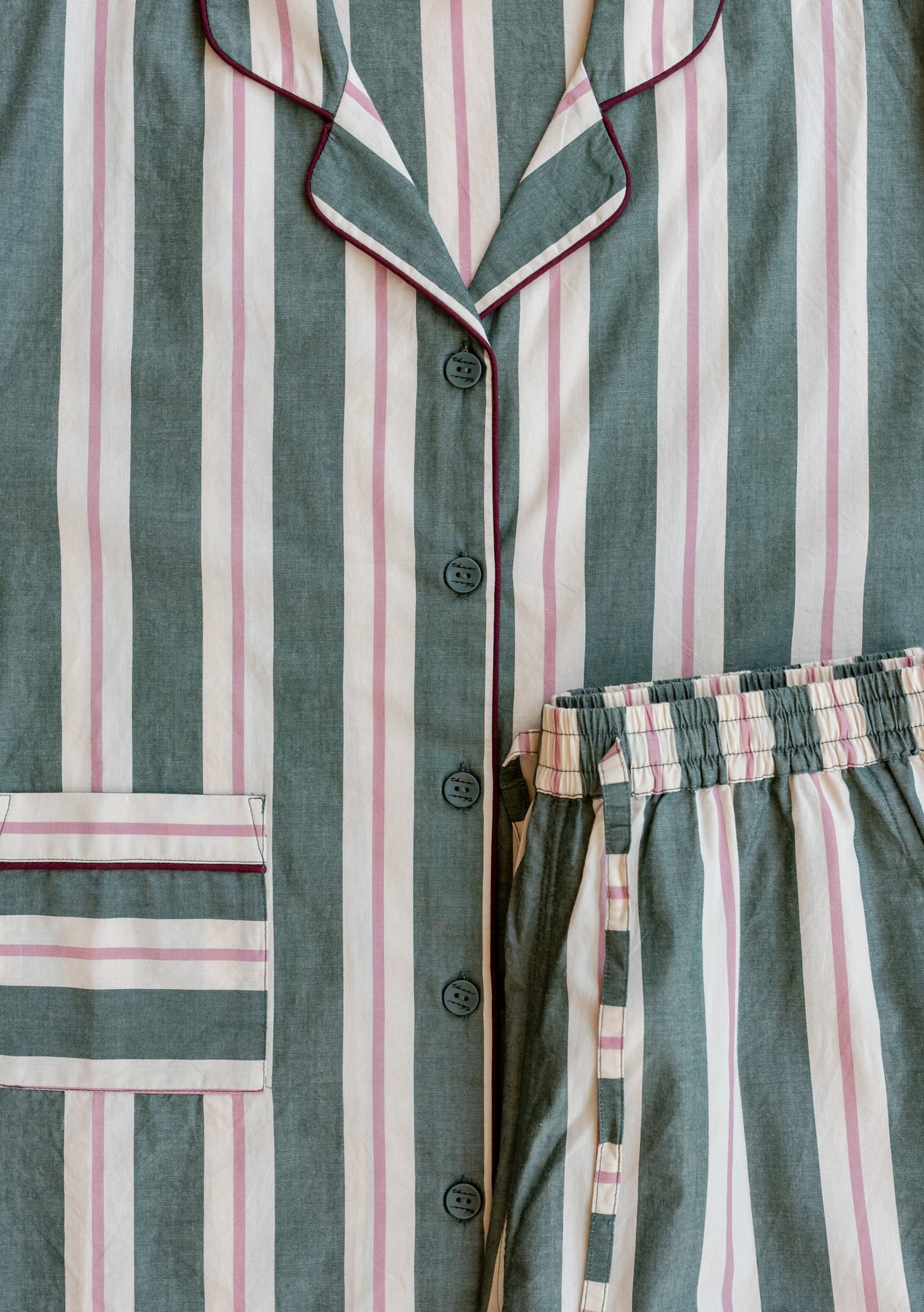 TBCo x Glassette Cotton Pyjamas in Green Stripe, featuring a button-front shirt and drawstring pants with burgundy piping, laid on a light wood surface.