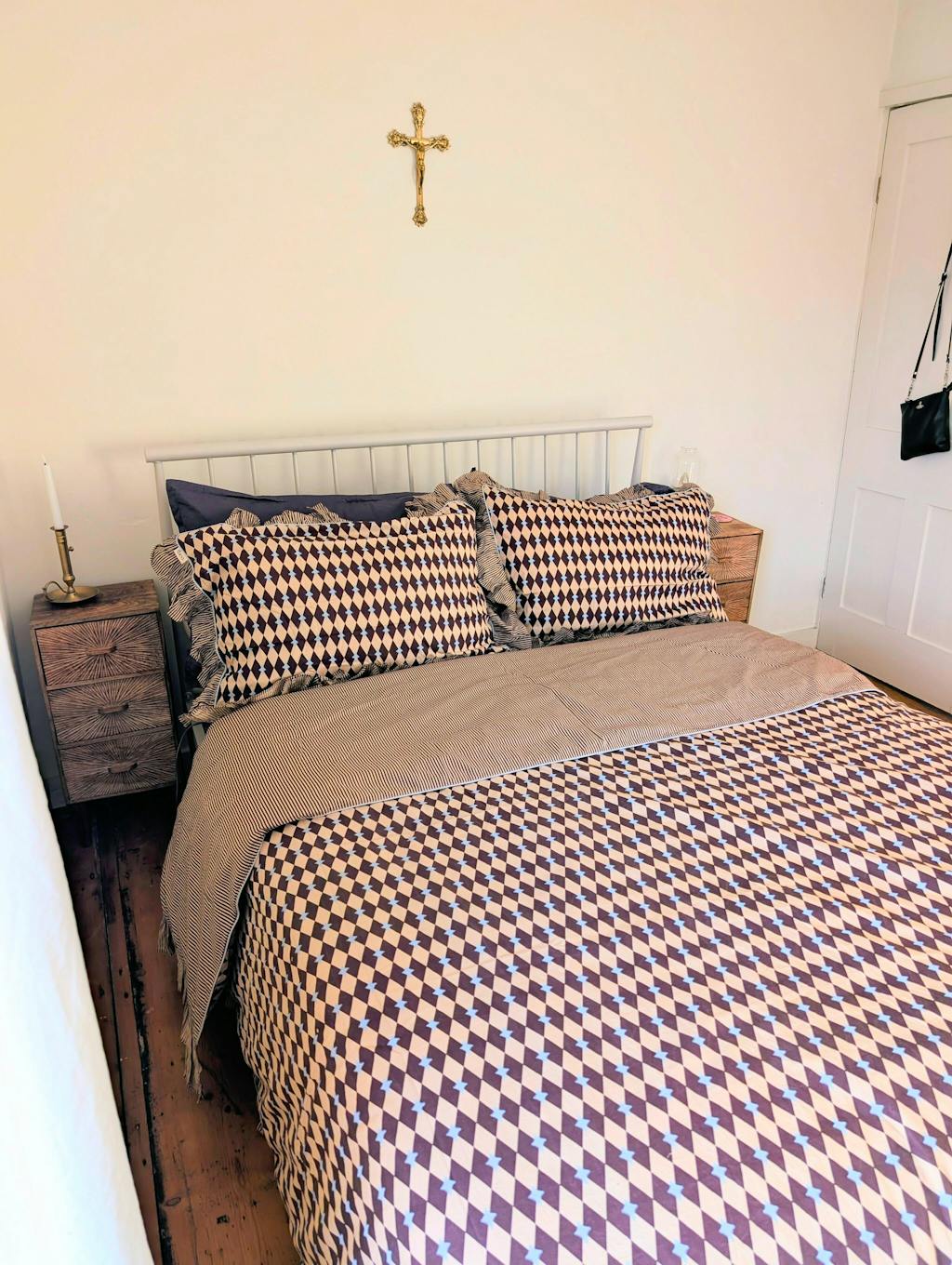 Absolute dopamine decor, it elevates my room with such joy and whimsy. The colours are muted enough so that there's not so much visual noise, it's still very sleepy and cosy. The only downside is that the ruffle trim isn't double sided! It would be nice to have the option to show the striped side, but then the trim would be on the blank side :/ a bit of an oversight for an otherwise perfect set.