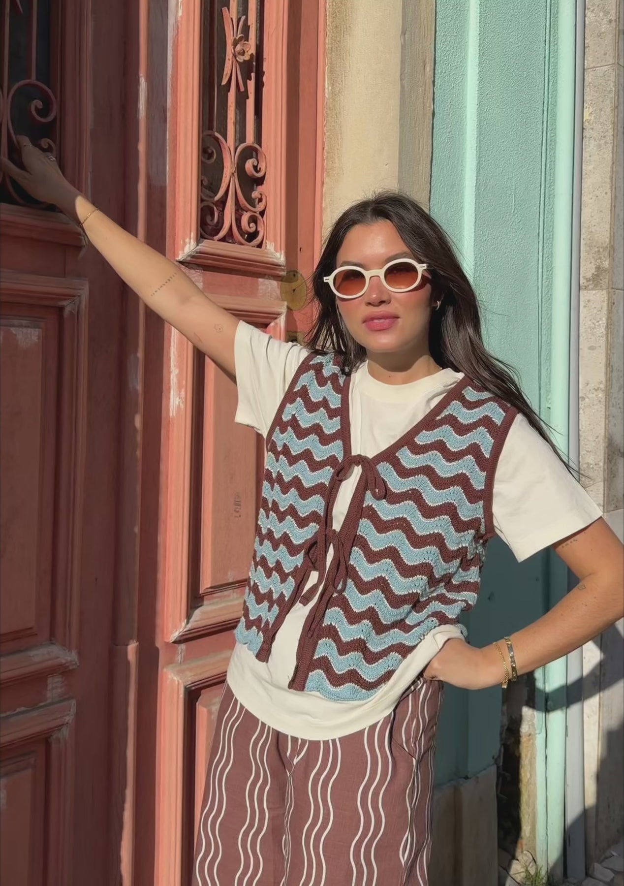 Diese Strickweste mit sanften blau-braunen Wellenstreifen besteht aus 100 % hochwertiger Baumwolle und verfügt über zwei Bindebänder vorne für individuelle Anpassung. Dank der feinen Lochmusterwebart ist sie atmungsaktiv und leicht und eignet sich daher ideal zum Kombinieren oder solo tragen.