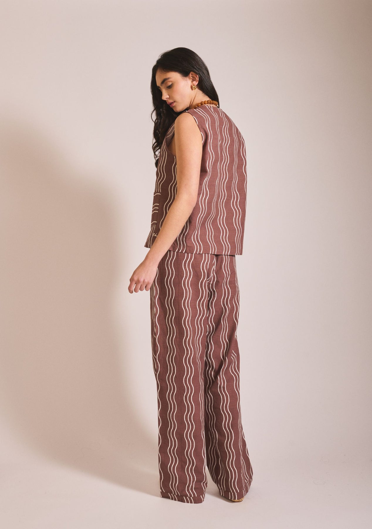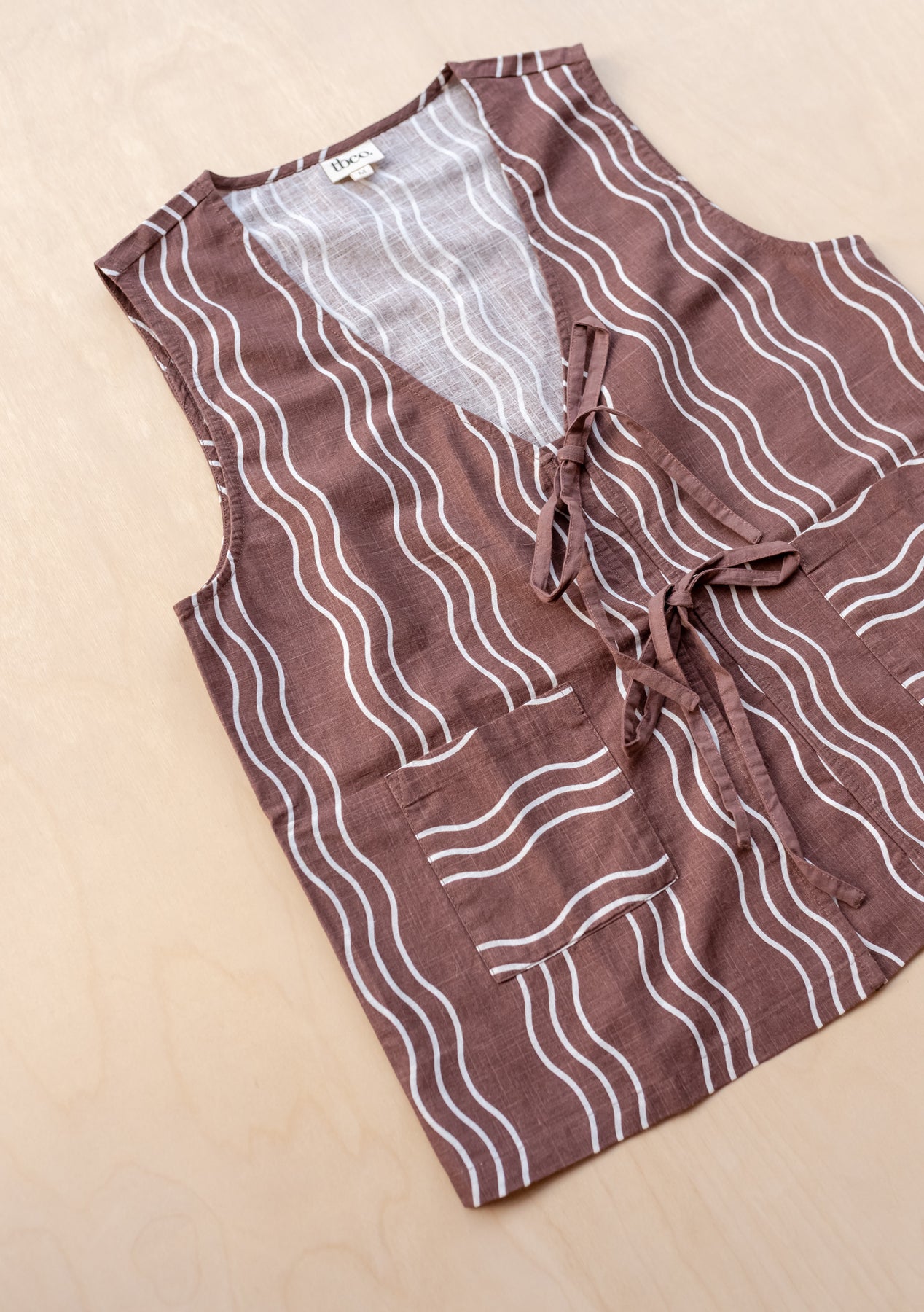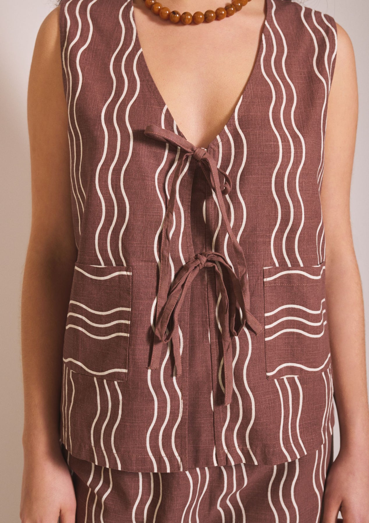 Dieses bequeme Top mit wellenförmigem braun-ecrufarbenem Streifenmuster ist aus 100 % hochwertiger Baumwolle gefertigt. Es verfügt über zwei Vordertaschen und Bindebänder für eine individuelle Passform. Es passt perfekt zu einer passenden Hose und sorgt für einen stimmigen Look. Der weiche und atmungsaktive Stoff garantiert ein entspanntes und angenehmes Tragegefühl.