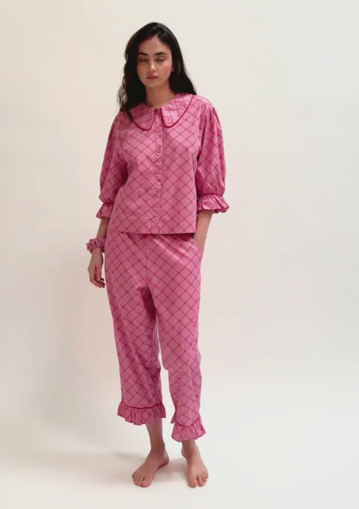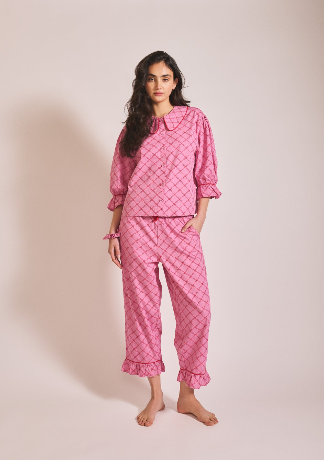 Model wearing TBCo Cropped Cotton Pyjamas in Pink Lattice with frilled cuffs, portrait orientation, gallery image one
