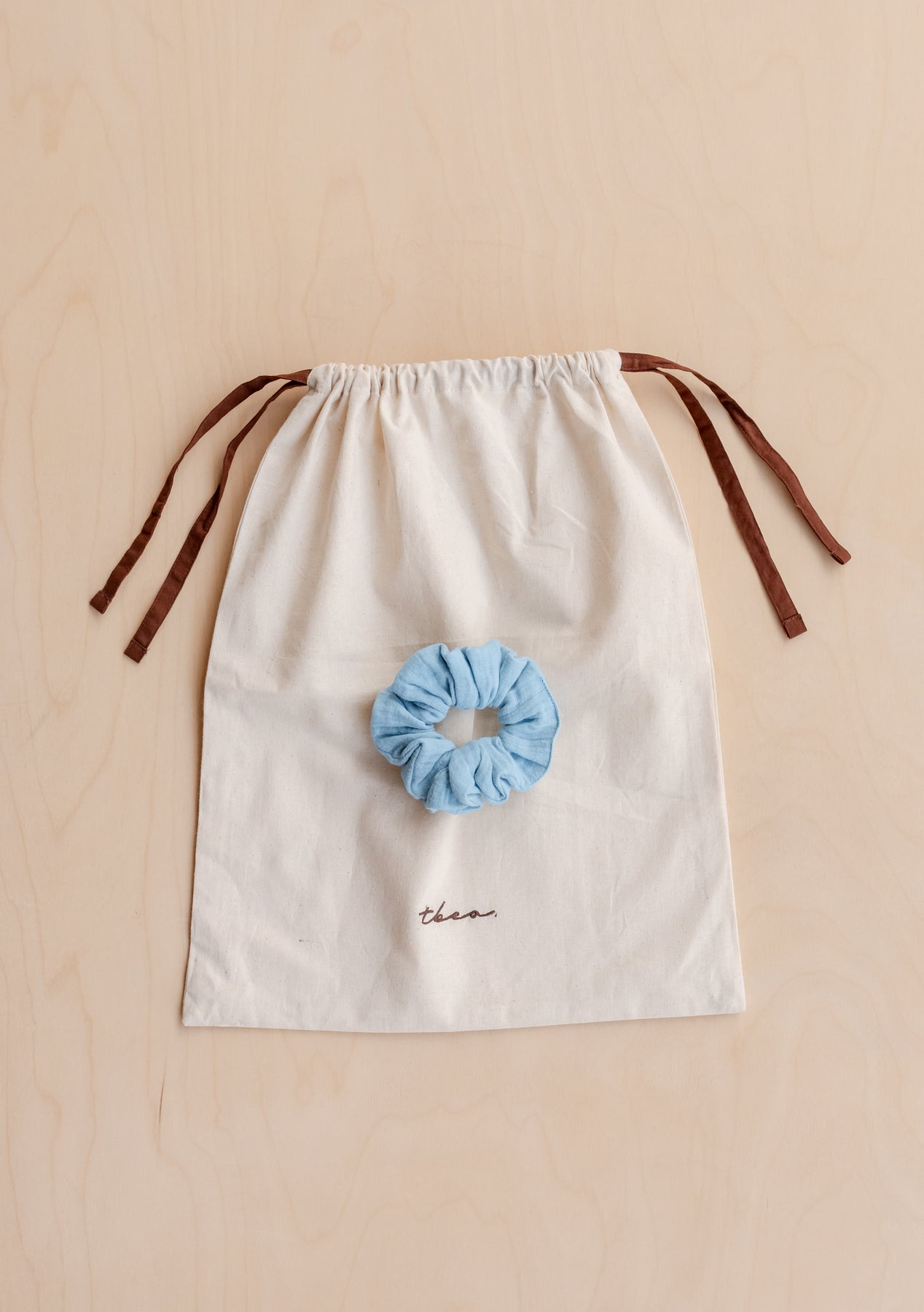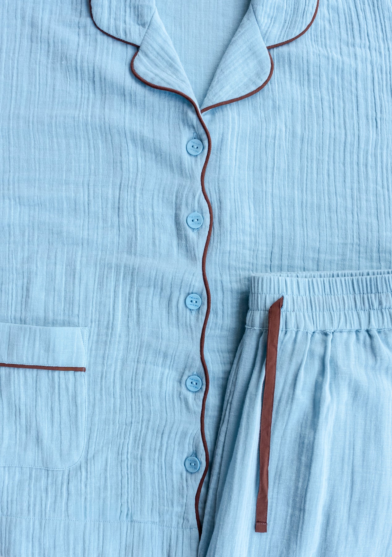 Slip into these perfectly designed PJ's in a soft blue cotton with brown contrast piping. When we say we've thought of everything, we really mean it. The drawstring is stitched into the comfortable elastic waist so that you'll never lose it. The sleeves are cropped so they won't get wet when you wash your face. The buttons are made from recycled materials. The crinkle gauze cotton is breathable, keeping you at the perfect temperature while you snooze. The scalloped edge on the cropped trousers are adorable. There is a matching scrunchie. And because we all love pockets, there are two on the top and two on the bottoms.
